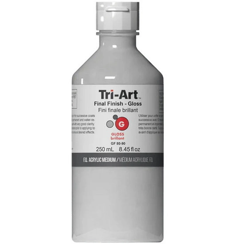 La couche de finition Tri-Art est un polymère autolissant conçu pour unifier le lustre d’une peinture. C’est un médium idéal pour la finition des peintures sur des supports flexibles. Ce médium peut être appliqué en couches minces sur la peinture entièrement sèche. Appliquer en couches minces et laisser sécher 12 heures entre les couches. Peut être teinté avec des acryliques liquides transparents. Remuer avant utilisation. Fabriqué au Canada