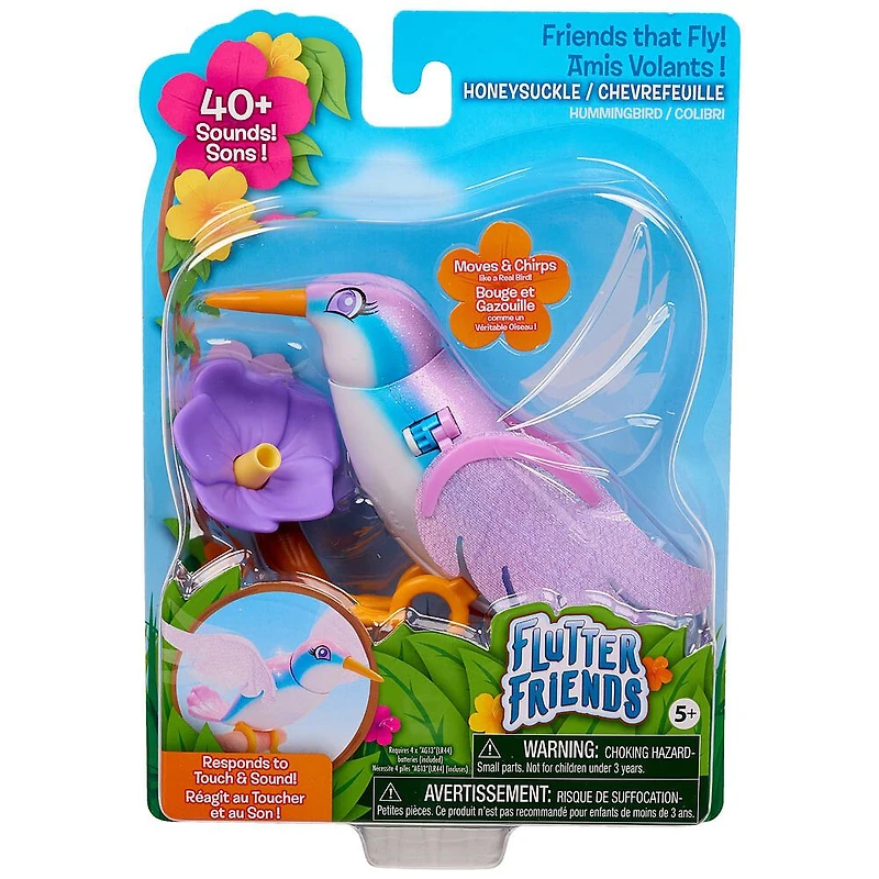 Notre exclusivité, uniquement chez Toys"R"Us. Caresse la tête ou le dos du colibri pour dévoiler plus de 40 sons réalistes de colibri ! Chaque caresse active une diversité de mouvements et de sons ! Chaque Flutter Friend comporte des ailes douces et scintillantes que les enfants adorent ! Les enfants peuvent tapoter une fois sur la tête de leur Flutter Friend pour l'activer, tapoter deux fois sur sa tête pour déclencher des sons et des gazouillements différents, et tapoter trois fois sur sa tête pour lancer des gazouillements musicaux ! Les enfants peuvent même aider leur Flutter Friend à apprendre à voler en tapotant deux fois sur son dos. Leur Flutter Friend déploie ses ailes en étant guidé dans les airs ! Chaque oiseau s'accompagne d'un accessoire de mangeoire en forme de fleur : mets le bec de ton Flutter Friend dans la mangeoire et laisse-le faire. Le colibri se tient en équilibre sur la fleur et bat des ailes en mangeant ! Les Flutter Friends se perchent facilement sur les doigts des enfants ou sur la branche de la fleur pour que les enfants puissent les emmener avec eux. Les Flutter Friends interagissent entre eux ! Claque des doigts ou tape des mains pour que chaque Flutter Friend batte des ailes et gazouille avec ses amis. A l'heure du repos, tapote et tiens la tête de ton Flutter Friend pendant 3 secondes pour qu'il s'endorme.Les Flutter Friends se présentent dans une diversité de couleurs, en permettant ainsi aux enfants de les collectionner et de créer leur propre monde Flutter ! Chaque oiseau vendu séparément. Caractéristique :Caresse la tête ou le dos du colibri pour dévoiler plus de 40 sons réalistes de colibri 4! Lance les gazouillements musicaux ! Pépie et fait des sons comme un véritable oiseau! Les Flutter Friends interagissent entre eux ! Les ailes bougent et remuent vraiment ! Comprend une mangeoire en forme de fleur. Les oiseaux se perchent facilement sur les doigts.(chaque Flutter Friend vendu séparément). 6 oiseaux à collectionner. Nécessite 4 piles AG13 (incluses).