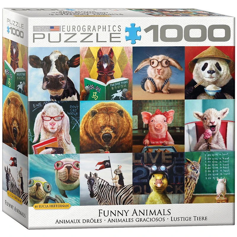 Eurographics Funny Animals * Illustrations de Lucia Heffernan *Puzzle de 1000 pièces * 19,25 x 26,6 pouces terminé * Fabriqué aux États-Unis * Tableau bleu recyclé * Encres végétales non toxiques