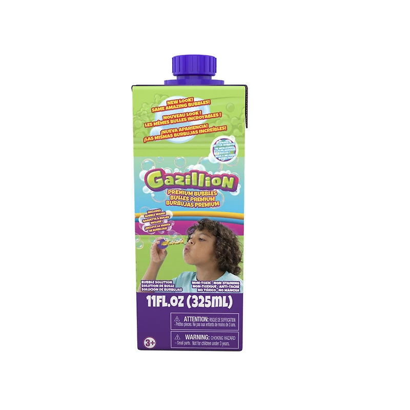 Nouveau look, même solution à bulles de qualité supérieure ! Notre " super solution " ultra-secrète, formulée pour créer les bulles les plus grosses, les plus brillantes et les plus colorées, est maintenant présentée dans une boîte d'emballage composée de matériaux 100 % recyclables ! Chaque boîte de 10 onces de solution Gazillion Bulles est accompagnée d'une baguette à bulles spécialement conçue qui peut être fixée sur le côté de la boîte et fonctionne avec tous les produits Gazillion Bulles. Notre solution de qualité supérieure est sûre, non toxique et sans taches ! Avec Gazillion Bulles, vous aurez des tonnes et des tonnes de bulles de plaisir ! Convient aux enfants de 3 ans et plus.