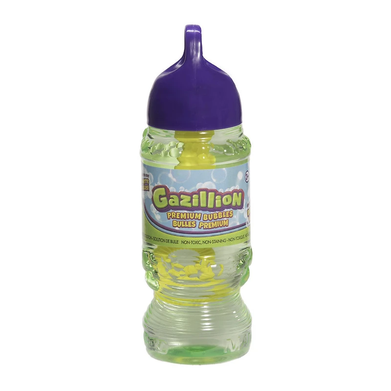 Cette solution à bulles ultra-secrète a été formulée pour créer les bulles les plus grosses, les plus colorées et chatoyantes du monde ! Chaque flacon de solution à bulles Gazillion de 10 onces est offert avec une baguette à bulles conçue spécialement pour tous les produits à bulles Gazillion. Cette solution de qualité supérieure est respectueuse de l'environnement, sécuritaire, non toxique, et ne tache pas les vêtements ou les meubles. Avec les bulles Gazillion, vous serez à bout de souffle avant de manquer de bulles ! À partir de 3 ans et plus.