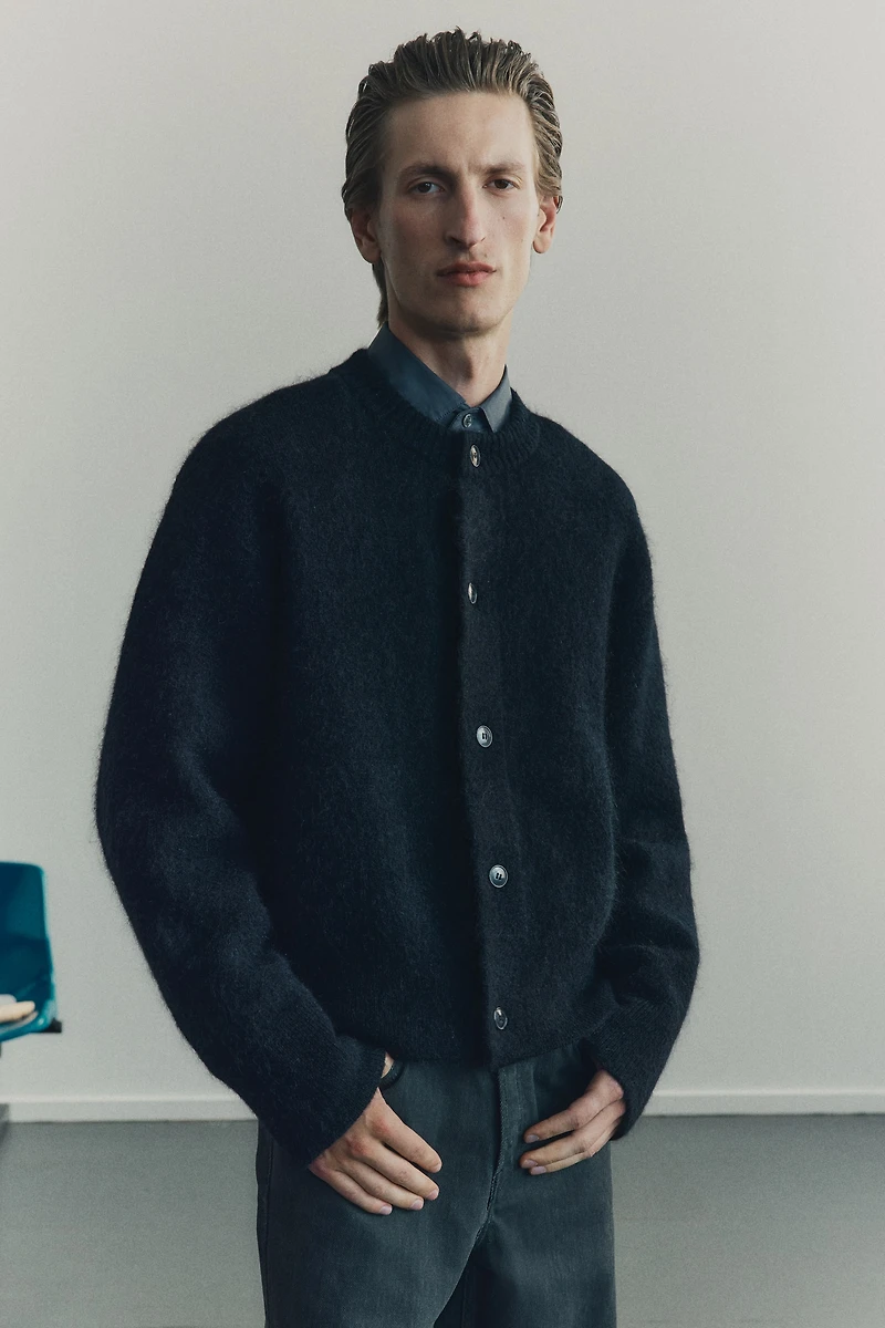 Gilet en doux tricot enrichi d'une touche de mohair et de laine. Modèle à bande côtelée autour de l'encolure ronde et boutonnage devant. Emmanchures tombantes et manches longues. Finition côtelée aux poignets et au bas. Coupe décontractée qui crée une silhouette détendue sans être trop grande.