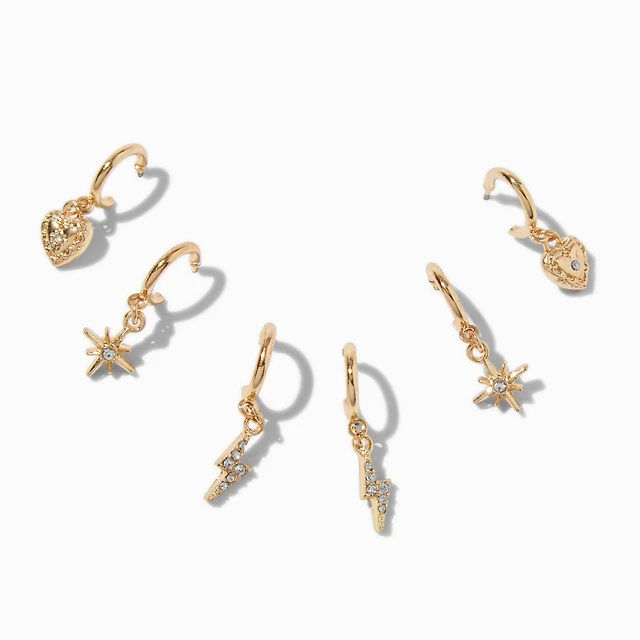 Gold-tone Lightning Bolt, Heart, Starburst Earring Stackables Set - 3 Pack