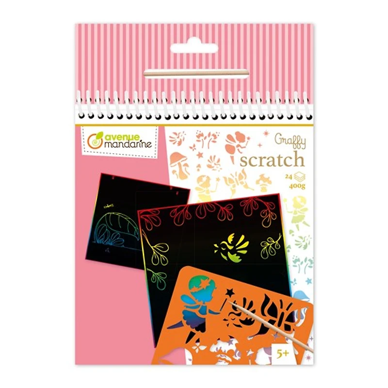 Ce carnet présente 24 cartes à gratter avec décors préimprimés. Grâce à la planche de pochoirs et au stylet en bois inclus, l'enfant pourra laisser libre cours à son imagination ! 5 ans et plus.