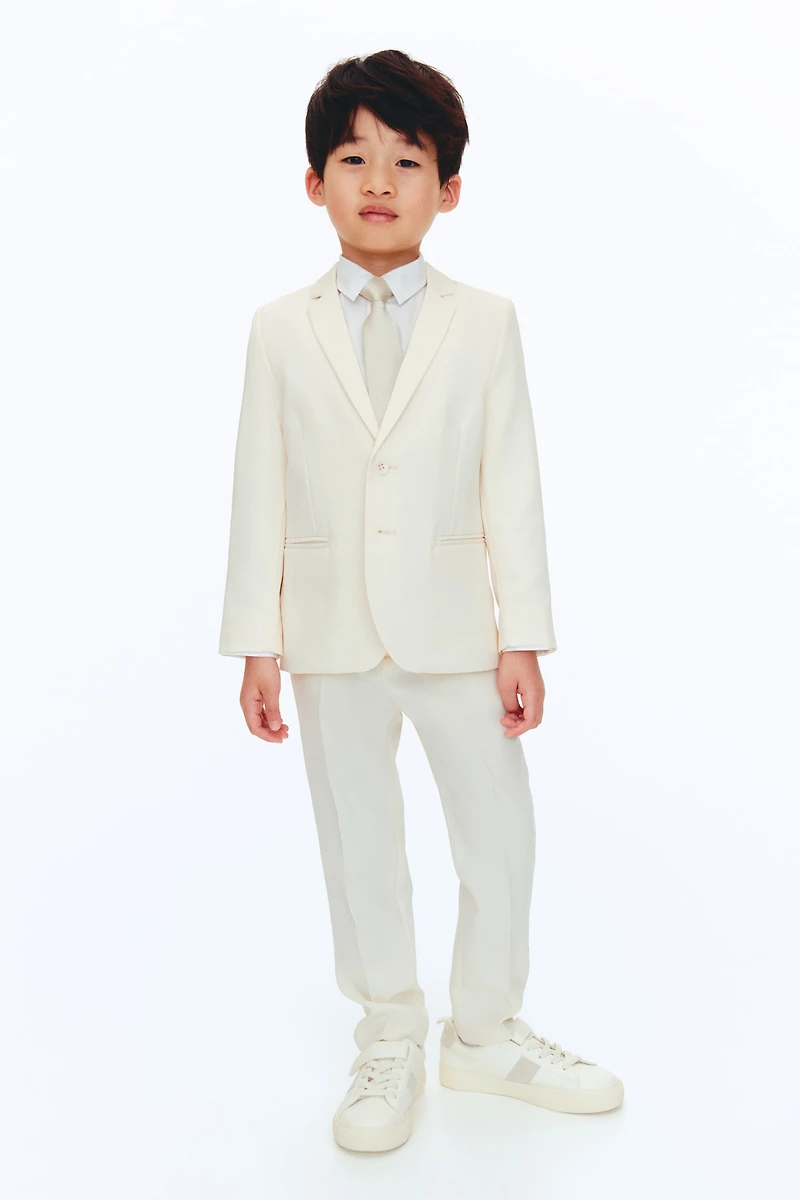 Ensemble composé d'un habit en tissu souple avec doublure, d'une chemise en popeline et d'une cravate pré-nouée assortie. Veste avec col à revers crantés et boutonnage devant. Poches raglan devant et fente dans le dos. Pantalon avec élastique réglable à la taille et braguette à fermeture éclair surmontée d'un bouton. Poche décorative dans le dos. Jambes avec plis marqués. Chemise avec col rabattu et boutonnage devant. Manches longues terminées par poignet boutonné. Empiècement dans le dos. Cravate avec bande élastique réglable et attache en plastique sur l’arrière.