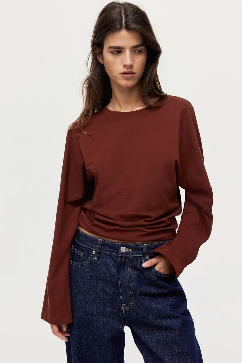 Haut en jersey de coton doux. Modèle ajusté avec encolure ronde, emmanchures fortement descendues pour un effet tombant et manches longues.