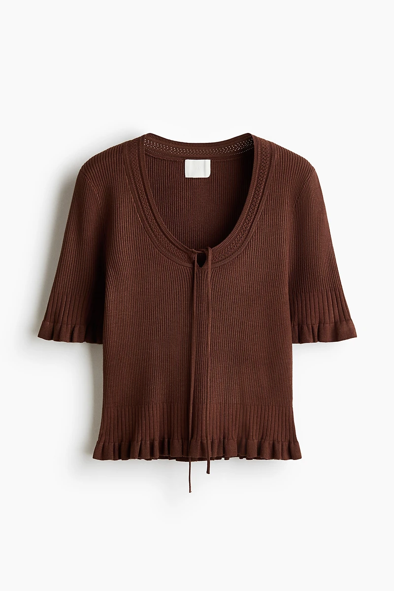 Haut en tricot finement côtelé. Modèle avec encolure dégagée en tricot pointelle, agrémentée de petits liens à nouer et d'une fente goutte d'eau devant, et manches courtes. Finition à volants en bas de manche et au bas.