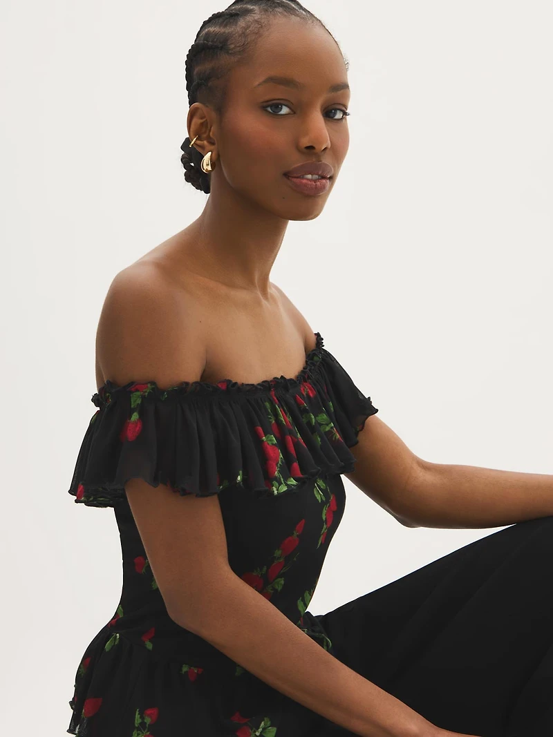 Ludique, ajustée et irrésistible. Ses épaules dénudées et ses volants superposés rehaussent la silhouette, tandis que sa coupe la rend flatteuse et féminine. Idéale pour les douces soirées d'été, les apéros en terrasse et toutes vos photos souvenirs.Haut en mailleImprimé de fruitsEncolure asymétriqueSilhouette inspirée du corsetVolants à l'encolure et à l'ourletEntièrement doublée de mailleAjustéeTrès extensibleSabrina mesure 5 pi 10'' et porte la taille PMatière: 95% polyester recyclé, 5% spandexLining: 95% polyester recyclé, 5% spandexLavage en machine à l'eau froide Suspendre pour sécher