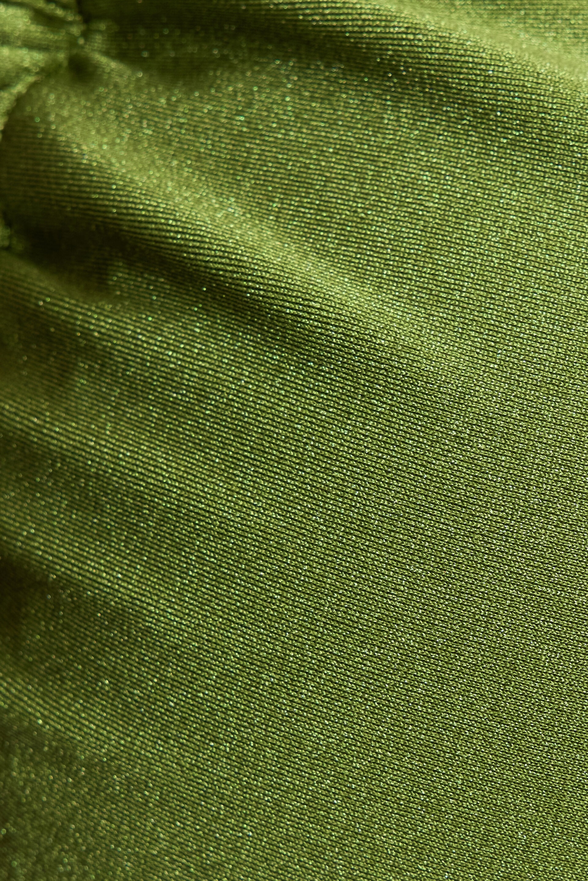 Voici un haut de bikini bandeau en jersey. Caractéristiques Détails de fausses perles Détails froncés Col en cœur Coussinets amovibles à la poitrine Attache à nouer dans le cou et au dos Taille et coupe Tissu extensible La mannequin porte la taille P Composition et entretien 82 % polyamide recyclé, 18 % spandex Laver à la main à l’eau froide Importé