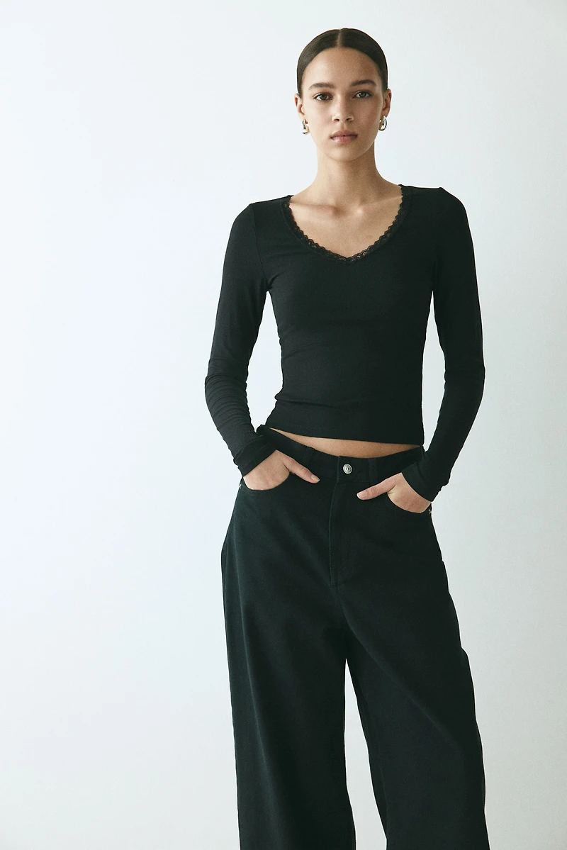 Haut ajusté en jersey côtelé. Modèle à manches longues avec encolure en V bordée de dentelle.