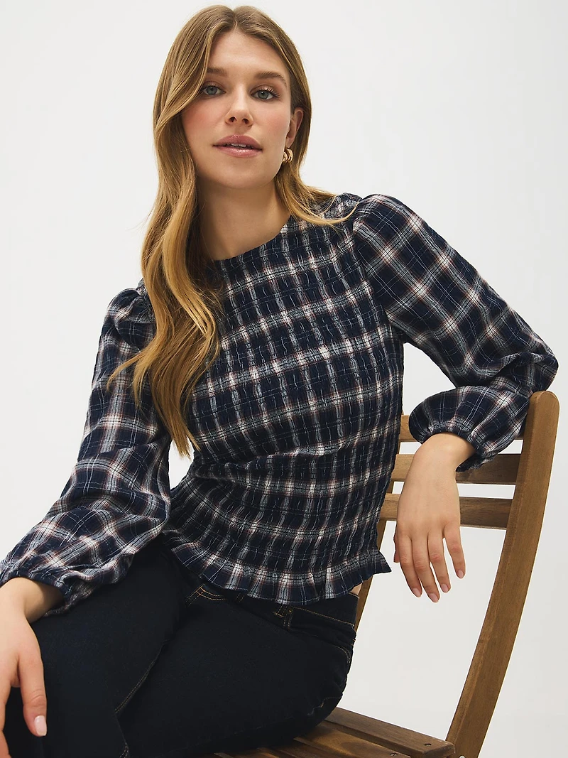 Des careaux toute l'année? Oui SVP! Ce haut revisite un imprimé classique en y ajoutant une touche féminine et délicate grâce à son ourlet volanté, ses manches longues et sa coupe ajustée près du corps. Facile à porter et flatteur, il est parfait pour une journée bien remplie ou un vendredi décontracté au bureau.Haut tisséCarreauxDétails smockésManches longues avec bandes élastiquesOurlet inférieur volantéMélange de cotonÀ enfilerIsabelle mesure 5 pi 8 po et porte la taille SMatière: 97% coton, 2% polyester, 1% spandexLavage en machine à l'envers à l'eau froideSuspendre pour sécher
