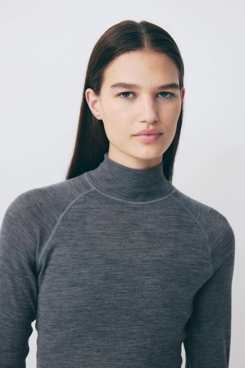 Haut moulant de base en jersey extensible de douce laine mérinos qui permet de rester au chaud pendant le ski. Coupe près du corps avec col cheminée et longues manches raglan.