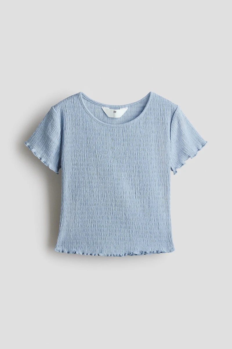 Haut en jersey nid d'abeille. Modèle à encolure ronde et manches courtes. Bord surjeté en bas de manche et au bas.