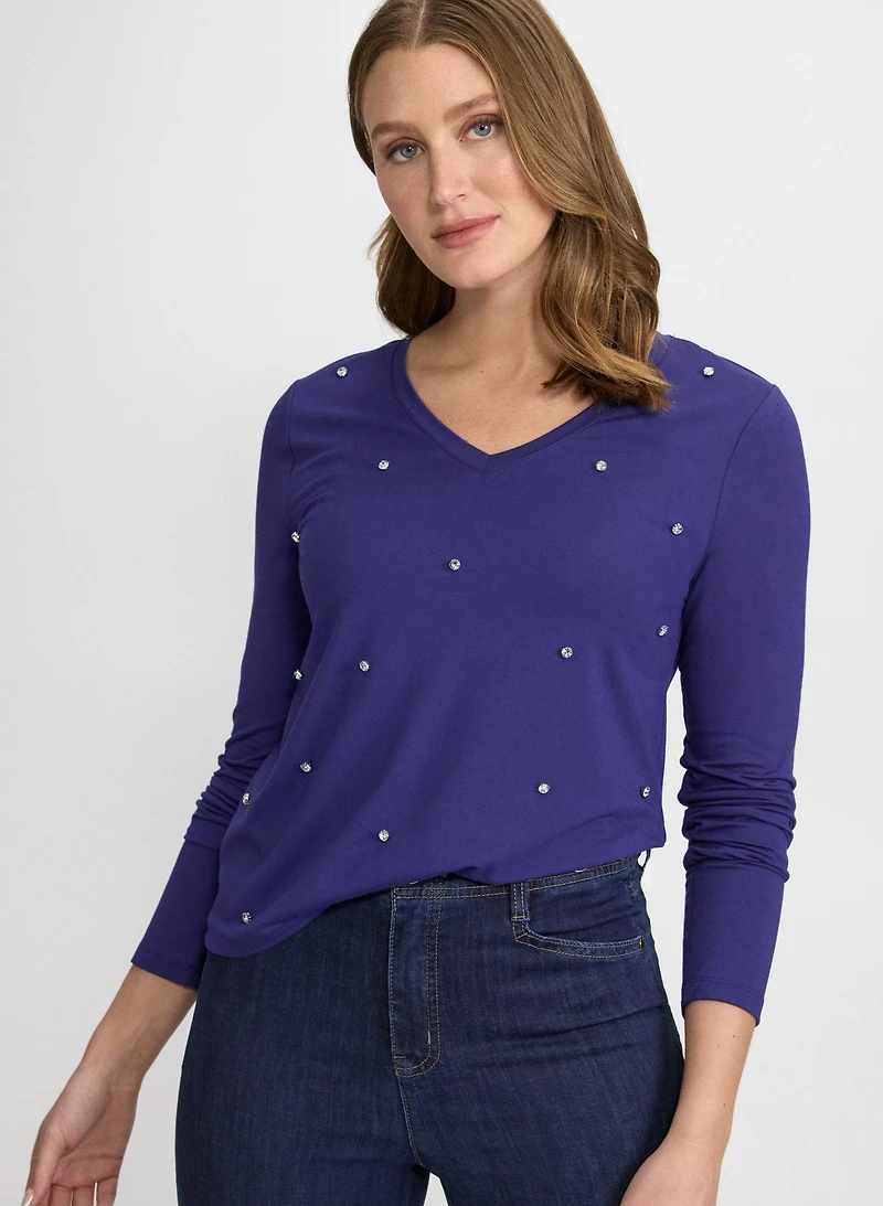 Enfilez notre haut classique à manches longues rehaussé de délicates pierres dispersées à l'avant, ajoutant une touche subtile d'éclat à votre look quotidien. Associez-le à un jean et des bijoux minimalistes. Silhouette décontractéeDevant orné de pierres disperséesDos uniEncolure en VManches longuesÉpaules tombantesMatière confortable et extensible