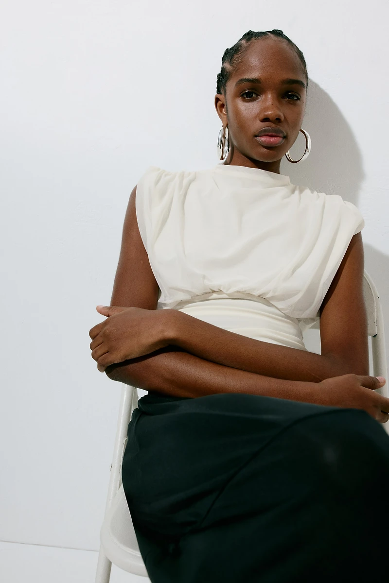 Haut sans manches ajusté avec corsage en filet à effet drapé. Modèle à col droit avec fronces sur les épaules et sous la poitrine. Partie en jersey interlock épais à la taille avec coutures latérales froncées. Doublé.