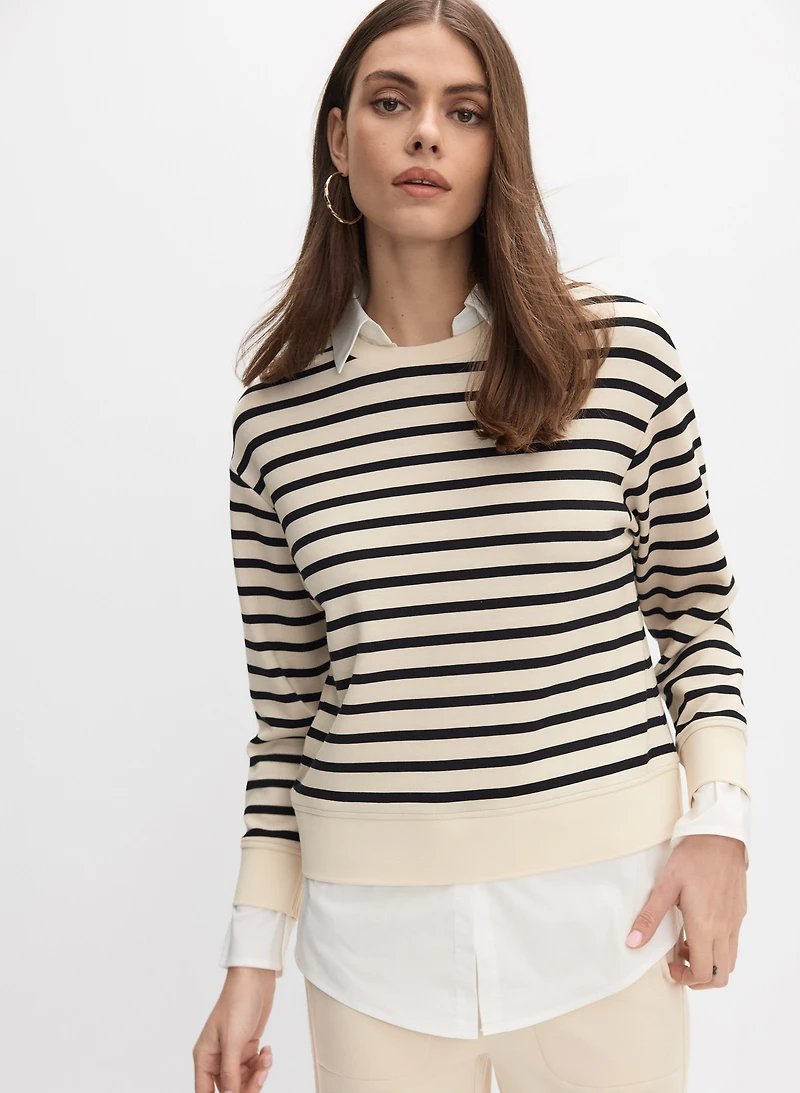 Notre haut trompe-l'œil à rayures séduit par son encolure ras-du-cou et ses manches longues, créant une silhouette moderne et élégante. Portez-le avec un pantalon à taille haute et des accessoires minimalistes pour un look raffiné. Rayures fines horizontales Col chemisier; encolure ras-du-cou Manches longues Style chemisier en popeline de coton Matière en tricot crêpe Longueur tunique