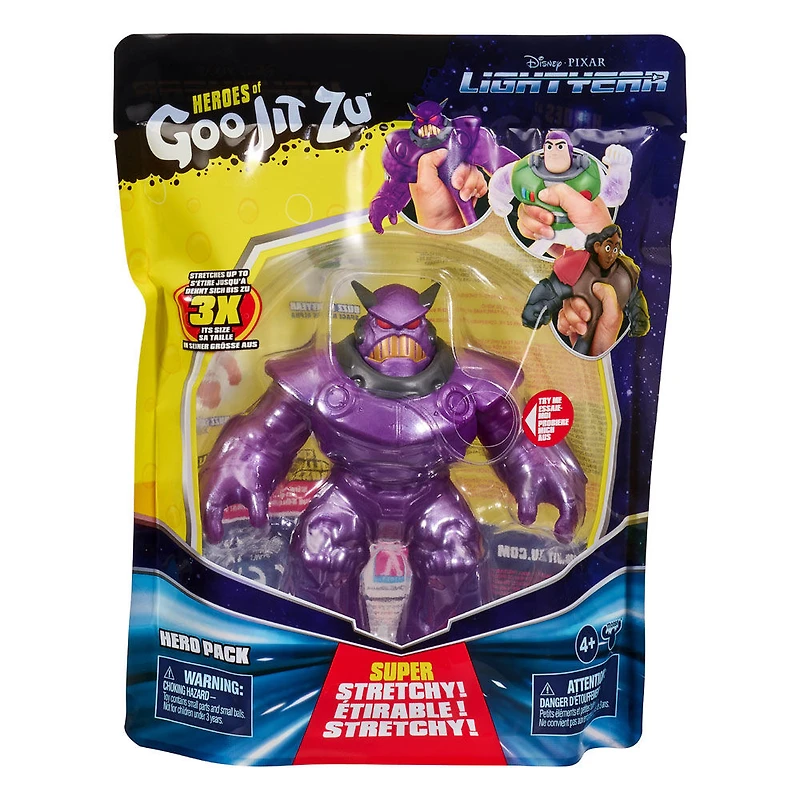 Disney Pixar Lightyear et les héros de Goo Jit Zu ont combiné leurs forces pour créer la gamme ultime des super-héros Lightyear les plus extensibles, les plus gluants et les plus spongieux de tous les temps ! C'est exact! Certains de vos personnages Lightyear préférés ont rejoint les héros de Goo Jit Zu et ont pris leurs pouvoirs spongieux, extensibles et gluants ! Jouez avec Zurg d'une manière jamais vue auparavant ! Écrasez, serrez et étirez son incroyable corps rempli de perles alors qu'il se bat contre Buzz l'Éclair et l'Alliance Galactique ! Zurg est super chouchou ! Il a un remplissage unique de perles violettes. Pressez-le et écrasez-le pour entendre et sentir son rembourrage scrunchy se déplacer à l'intérieur de son corps ! Maintenant, vous pouvez jouer avec votre héros Zurg d'une nouvelle manière gluante sans gâchis ! Serrez, écrasez et étirez ses bras, ses jambes et son corps ! Son incroyable corps extensible peut s'étirer jusqu'à 3 fois sa taille, puis reprendre sa forme et sa taille d'origine ! Aventurez-vous dans l'infini et au-delà avec toutes les figurines Lightyear Goo Jit Zu et découvrez une nouvelle façon de jouer et de sauver la journée avec ces super jouets à collectionner !