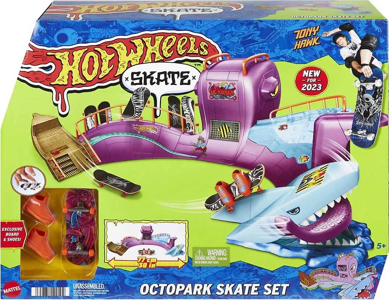 Ridez avec style grâce à ce coffret Skatepark Octopus de Hot Wheels Skate. Prenez de l'élan en descendant par l'énorme tête de pieuvre et amusez-vous en fingerskate sur un parcours dément comprenant des rails, des quarter-pipes et d'autres modules comme une tête de requin qui claque la mâchoire. Le coffret inclut un fingerboard exclusif entièrement monté et une paire de chaussures amovibles pour doigts. Un espace à l'arrière de la structure permet de ranger trois fingerboards et cinq paires de chaussures supplémentaires. (Autres fingerboards et chaussures vendus séparément.) Les couleurs et les décorations peuvent varier.