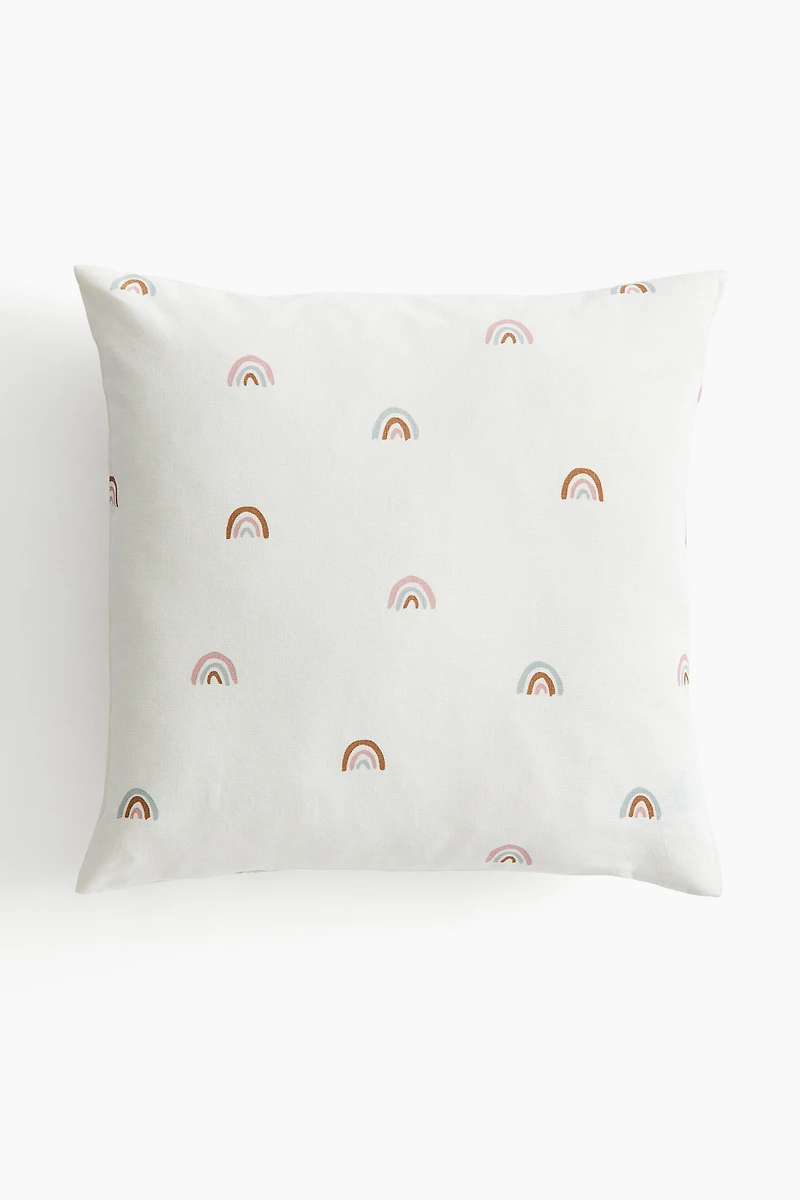 Housse de coussin en coton tissé avec impression complète. Modèle avec fermeture à glissière dissimulée sur un côté.