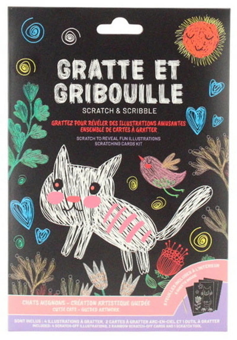 Sont inclus : 4 illustrations à gratter, 2 cartes à gratter arc-en-ciel et 1 outil à gratter.