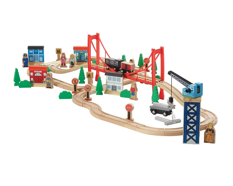 Comprend 3 trains, une grue, 51 pièces de cargo, 1 pont, 4 bâtiments (3 pièces chaque), 13 arbres et buissons, 3 animaux et 30 pièces de rail.