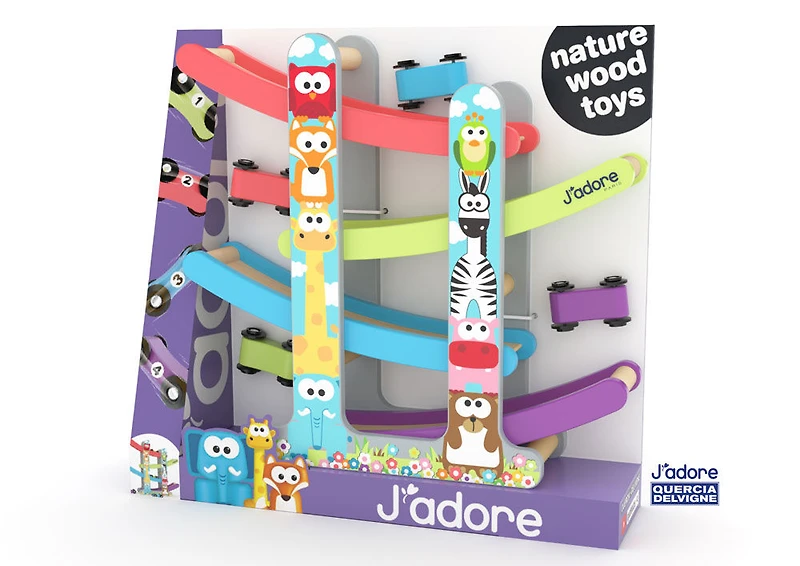 Alimentez l'imagination! Dévalez la rampe et soyez le premier à terminer ! Des voitures de course aux couleurs vives passent devant d'adorables animaux de zoo. Jouer avec des voitures miniatures stimule la motricité fine, aide à la coordination oeil-main et améliore la dextérité et le développement musculaire.