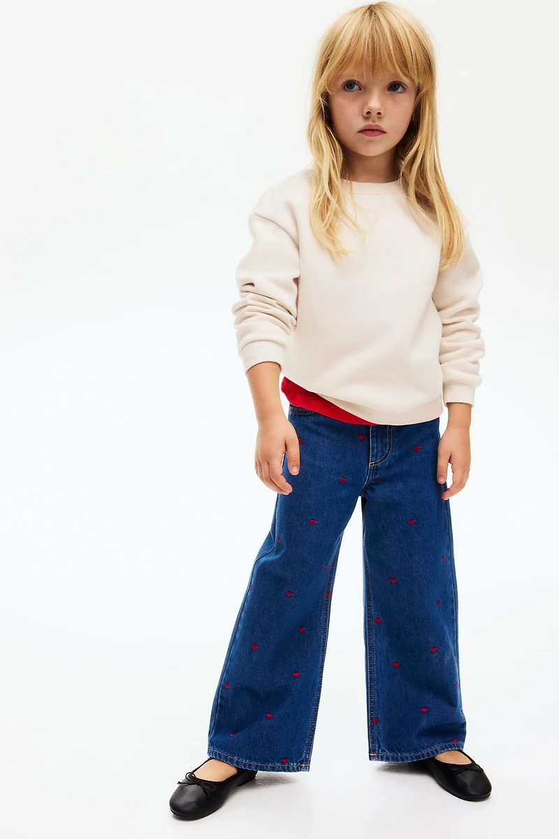 Jean 5 poches en denim de coton avec petits motifs. Coupe flottante au niveau des hanches et des cuisses avec jambes larges. Modèle avec élastique réglable à la taille et braguette à fermeture éclair surmontée d'un bouton-pression.