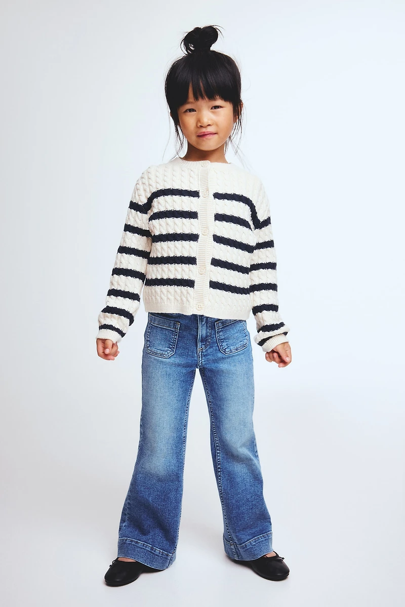 Jean en denim souple de coton mélangé. Coupe classique au niveau des hanches et des cuisses avec jambes évasées. Modèle avec élastique réglable à la taille et braguette à fermeture éclair surmontée d'un bouton-pression. Poches plaquées devant et poches dans le dos.