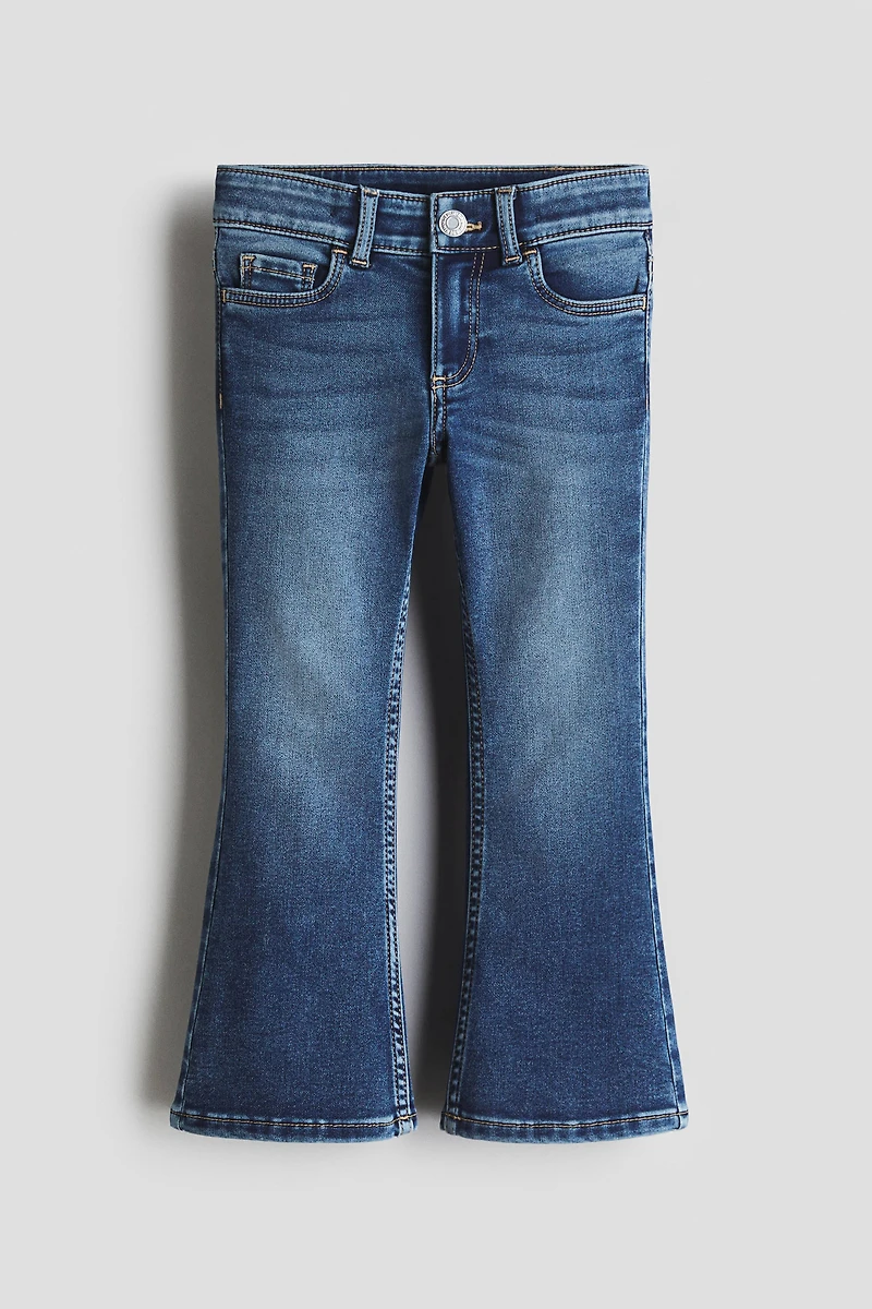 Jean 5 poches en denim de coton extensible. Coupe près du corps au niveau des hanches et des cuisses avec jambes évasées. Modèle avec élastique réglable à la taille et braguette à glissière surmontée d'un bouton-pression.