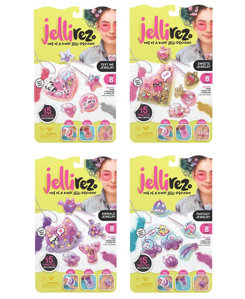 Réalise des créations de bijoux dignes d'insta avec Jelli Rez: crée un collier, des bagues et des barrettes uniques en seulement 15 minutes avec un processus facile en 3 étapes - mélange les composés de gel avec des paillettes scintillantes, verse-le dans un moule et décore avec des autocollants, attend 15 minutes, puis porte ou partage avec tes amis! Sans Danger, sèche à l'air 15 minutes: contrairement à la vraie résine, Jelli Rez sèche naturellement à l'air en seulement 15 minutes sans avoir besoin de lumière bleue pour l'aider à durcir. Crée jusqu'à 8 modèles: chaque ensemble de bijoux Jelli Rez comprend tout ce dont tu as besoin pour créer jusqu'à 8 modèles jelli uniques, y compris 4 bijoux: 2 barrettes, 1 bague et 1 collier. Collectionne les 4 thèmes: crée un monde de designs Jelli Rez uniques inspirés de thèmes amusants, notamment des bonbons, fantaisie, texte-moi et animaux. Améliore tes créations Jelli: utilise différentes couleurs de paillettes pour créer de beaux effets dégradés ou ombrés. Visite le site Web de Jelli Rez pour plus de conseils et astuces de conception. Contient: 2 bouteilles de 15 g de composé Jel, 1 x grand moule, 3 x petits moules, 2 x bols, 2 x spatules, 2 x barrettes, 1 x bague, 1 x chaîne de collier et pièces, 2 x sachets de paillettes, 2 x feuilles de déco, 1 x paire de pinces et 1 x manuel d'instructions Jelli Rez Ensemble de Bijoux - Kit d'activités artisanales inspiré de la résine de bricolage rapide et facile pour les enfants de 7 ans et plus. Jelli Rez te permets de créer des designs uniques inspirés de la résine en utilisant un processus amusant et facile en 3 étapes qui ne prend que 15 minutes - il suffit de mélanger, de mouler et de porter! Contrairement à la vraie résine, Jelli Rez sèche naturellement et en toute sécurité en 15 minutes sans utiliser de lumière bleue. L'ensemble de bijoux comprend tout ce dont tu as besoin pour créer jusqu'à 8 modèles Jelli uniques. Collectionne les 4 ensembles thématiques pour créer un monde de Jelli Rez, y compris: bonbons, Texte-Moi, Fantaisie et Animaux. Crée des bagues, des colliers et des pinces à cheveux que tu peux porter ou partager avec tes meilleures amies!