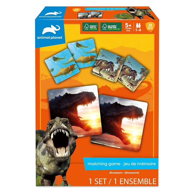 Quel joueur a la meilleure mémoire et trouvera le plus de paires de tyrannosaures, tricératops, ptéranodons et autres dinosaures du monde préhistorique? C'est le jeu classique de correspondance d'images, mettant désormais en vedette des dinosaures! Retournez les tuiles colorées pour trouver certains des dinosaures les plus connus. Celui qui trouve le plus de paires gagne! Comporte de belles images de dinosaures. Tuiles en carton épais, durables et plus faciles à saisir avec de petites mains! Les cartes de jeu sont fabriquées avec des matériaux certifiés FSC provenant de forêts gérées de manière durable afin de préserver leur état pour les générations futures.