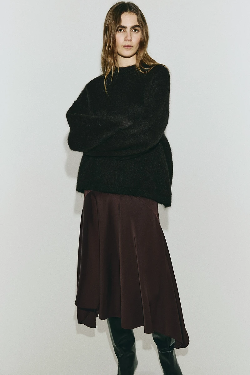 Jupe au mollet, ajustée, en sergé de satin au tombé fluide. Modèle taille haute avec fermeture par agrafe et fermeture éclair dissimulées sur un côté. Couture incurvée sous les hanches pour un effet évasé formant des plis souples vers le bas incurvé. Non doublée.