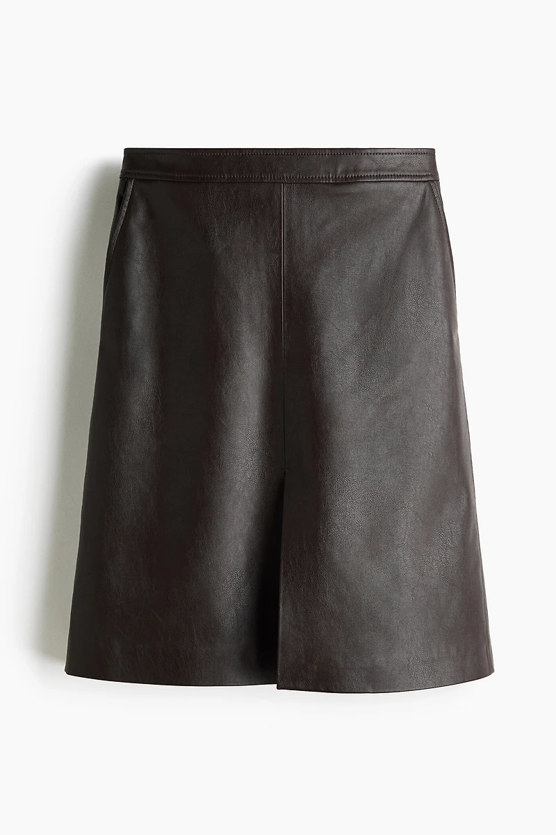 Knee-length skirt in coated fabric featuring a high waist with a concealed zip and a hook-and-eye fastener at the back. Diagonal side pockets and a straight hem with a slit at the front. Lined.