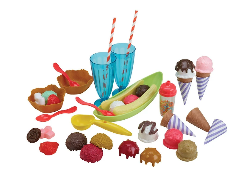 Ensemble de crème glacée et gaufre Pretend & Play de 44 pièces. Les principales caractéristiques de cet ensemble incluent un banana split, 2 bols gaufrés réalistes, 10 boules de crème glacée, 3 sauces à crème glacée, 3 garnitures à saupoudrer et plus encore. Faisant partie de la collection Design Your Own, les boules de crème glacée, sauces et garnitures sont toutes empilables, afin de permettre à vos enfants de créer leurs propres combinaisons. La cuillère à crème glacée est d'ailleurs conçue pour que vos enfants puissent réellement prendre les boules et ainsi leur offrir une expérience de jeu plus interactive.