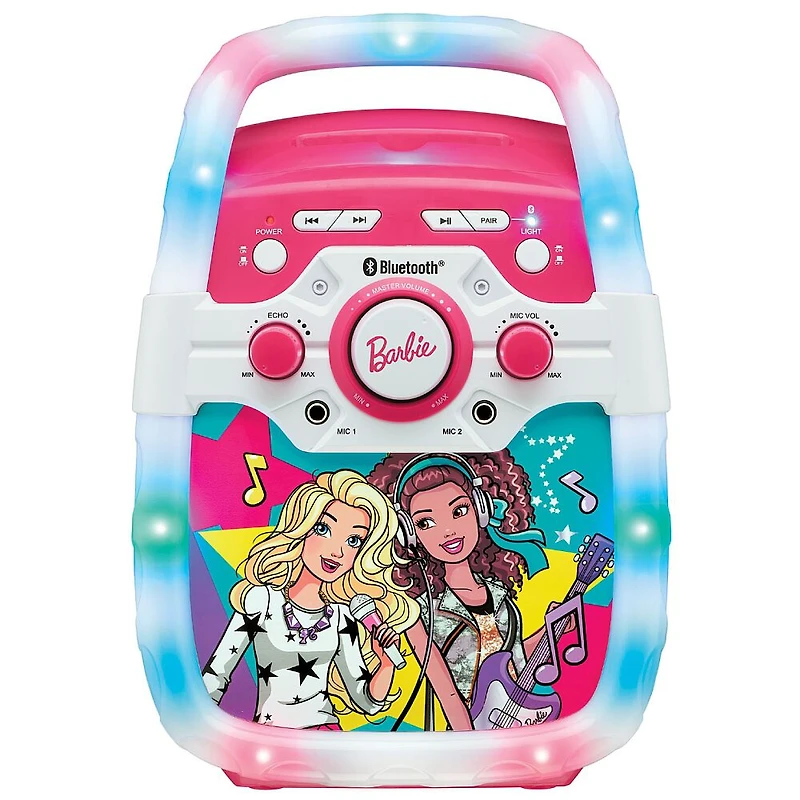 Dansez et chantez à vos chansons préférées avec le karaoké avec lumières clignotantes de Barbie! Cette fête de musique portative est aussi compatible avec Bluetooth permettant de connecter votre iPod, iPhone, iPad ou tablette afin jouer vos chansons préférées. Vous pouvez aussi faire un duo de karaoké avec vos amies préférées! (2ème microphone non inclus).