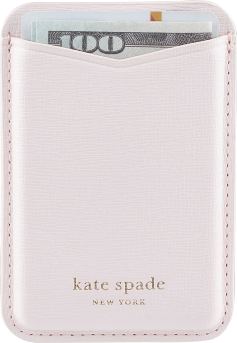 kate spade New York160MagSafe Wallet The MagSafe Wallet goes everywhere with you! Snap it onto the back of your MagSafe-compatible phone case to carry all your cards cash and IDs in a chic kate spade new york design. Product Features Signature kate spade new york design Holds up to 3 cards and cash Features cutouts to easily remove cards and cash Strong built-in magnets for MagSafe Snap on snap off with a magnetic connection for wireless charging Compatible with MagSafe devices and cases Limited Lifetime Warranty