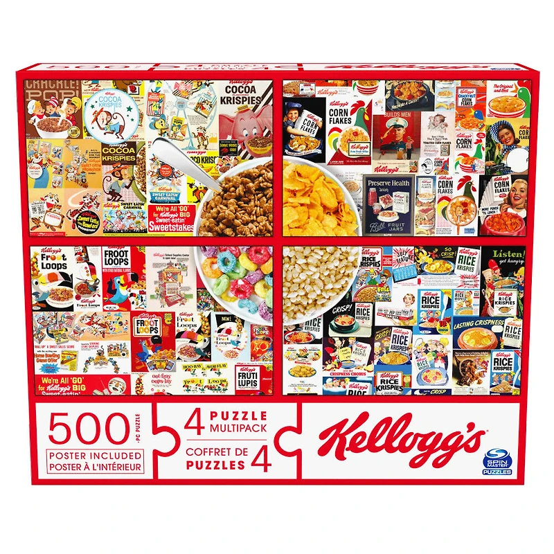 Kellogg's, Coffret de 4 puzzles, 500 pièces qui se combinent pour former un méga puzzle : Cocoa Krispies, Corn Flakes, Fruit Loops, Rice Krispies