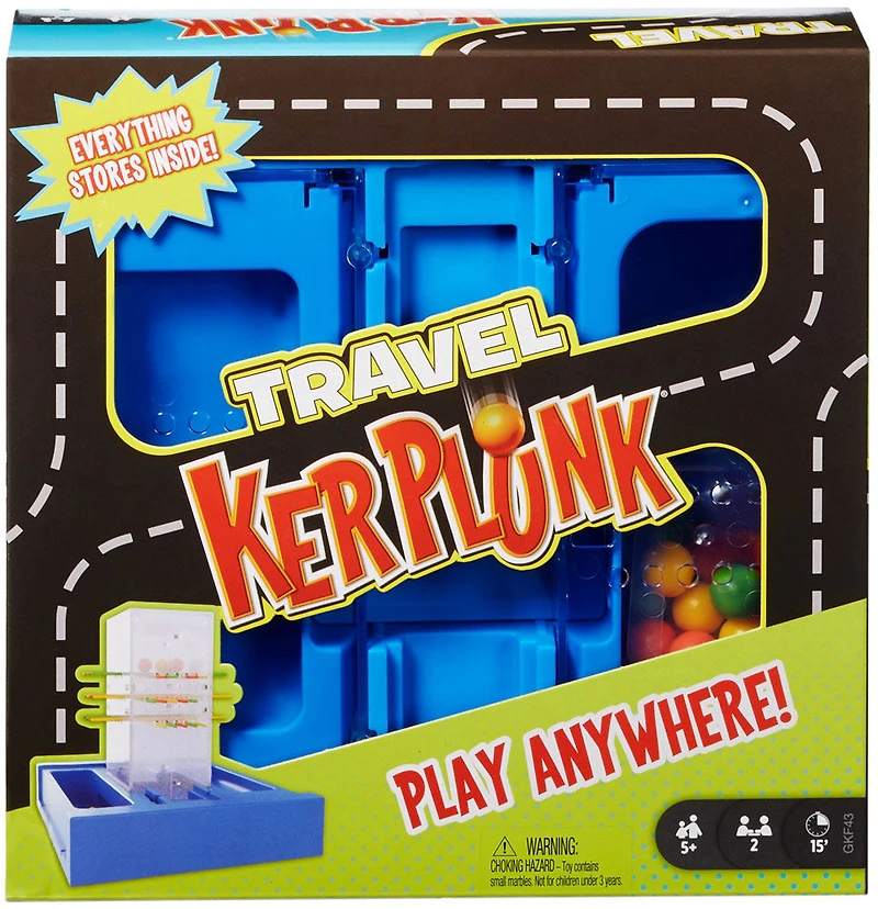 Apportez le plaisir partout avec les Jeux de voyage Mattel! KerPlunk Voyage propose tout le plaisir du jeu original pour enfants, avec un concept convivial qui le rend facile à jouer partout. Gardez la main ferme lorsque vous sortez un bâtonnet de la tour sans laisser tomber les billes. Le joueur ayant fait tomber le moins de billes à son tour est déclaré vainqueur! ​Cette version de voyage du jeu préféré des familles comprend 1 base qui attrape les billes lorsqu'elles tombent et sert également de rangement portatif pratique. KerPlunk Voyage est facile à apprendre et amusant à jouer, en plus de constituer un excellent cadeau pour les 5 ans et plus. Collectionnez tous les Jeux de voyage Mattel pour plus de plaisir pendant les déplacements (chacun vendu séparément, selon la disponibilité). Les Jeux de voyage Mattel permettent d'emporter facilement vos jeux préférés avec vous pour vous amuser en famille lors de vos déplacements! KerPlunk Voyage propose tout le plaisir du jeu classique pour enfants avec 1 base qui sert aussi de rangement intégré. Tout comme dans le jeu KerPlunk original, gardez la main ferme lorsque vous sortez un bâtonnet de la tour - et ne laissez pas les billes tomber et faire "KerPlunk!". À la fin de la partie, le joueur ayant fait tomber le moins de billes est déclaré vainqueur. Cette version de voyage du jeu préféré des familles comprend 1 base qui attrape les billes lorsqu'elles tombent et sert également de rangement portatif pratique pour emporter tout le plaisir avec vous partout! Facile à apprendre et amusant à jouer, KerPlunk Voyage est idéal pour les enfants de 5 ans et plus. Collectionnez tous les Jeux de voyage Mattel pour plus de plaisir pendant les déplacements (chacun vendu séparément, selon la disponibilité). Les couleurs et les motifs peuvent varier. Mise en garde : Risque d'étouffement : Peut produire de petites pièces. Déconseillé aux enfants de moins de 3 ans.