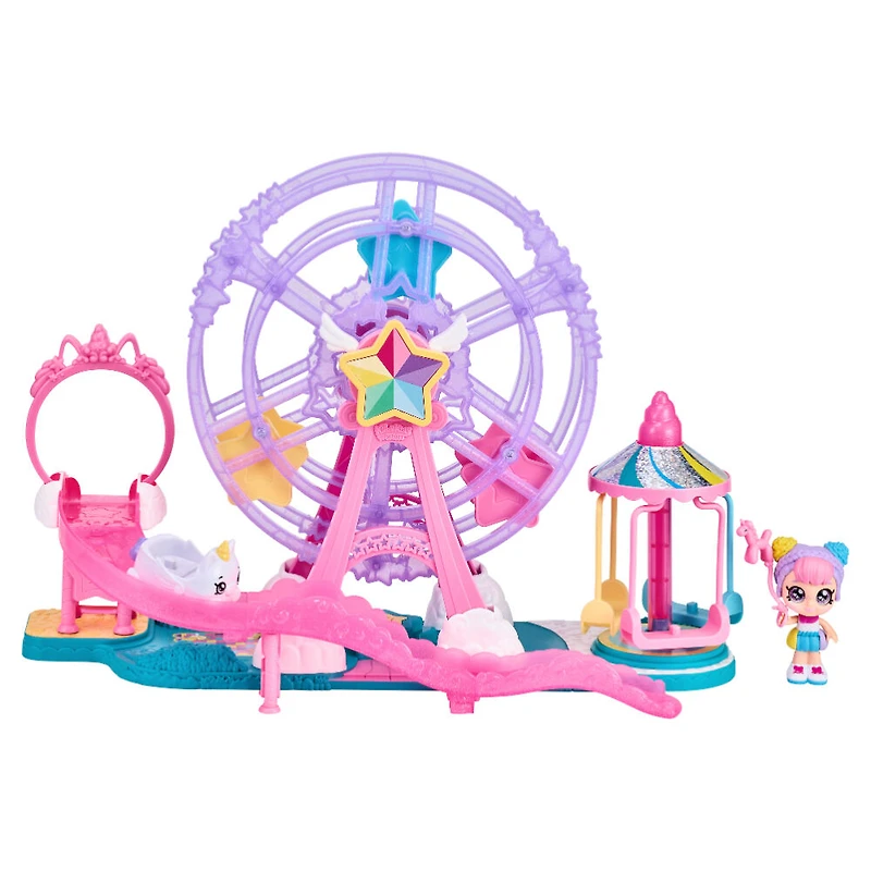 Bienvenue dans le merveilleux petit monde de Kindi Kids Minis ! Kindi Kids Minis Unicorn Carnival Playset ! C'est vrai ! Le carnaval de la licorne est arrivé en ville et Rainbow Kate est ravie d'emmener ses amis dans tous les manèges Rainbow-Tastic ! Les Kindi Kid Minis vont vivre la journée la plus amusante de tous les temps ! Poussez le chariot de la licorne dans les montagnes russes ! Tournez la grande roue de la grande étoile pour que Rainbow Kate et 2 de ses mini-amis puissent faire un tour. Puis faites tourner la balançoire arc-en-ciel pour faire tournoyer ces jolies petites filles ! Le carnaval de la Licorne a assez de place pour permettre à 7 Kindi Kid Minis de rouler en même temps et comprend un Rainbow Kate Mini exclusif. Elle est livrée avec l'animal ballon licorne le plus mignon qu'elle puisse tenir dans sa main ! Toujours plein de plaisir Bobbly-Wobbly, ce fabuleux Kindi Kid Mini est livré à la vie dans la paume de votre main pendant que leur petite tête bouge ! Kindi Kid Mini dans votre poche ou emmenez toute l'équipe dans votre sac à dos, car ces filles amusantes sont de la taille parfaite pour un rendez-vous de jeu à emporter partout.