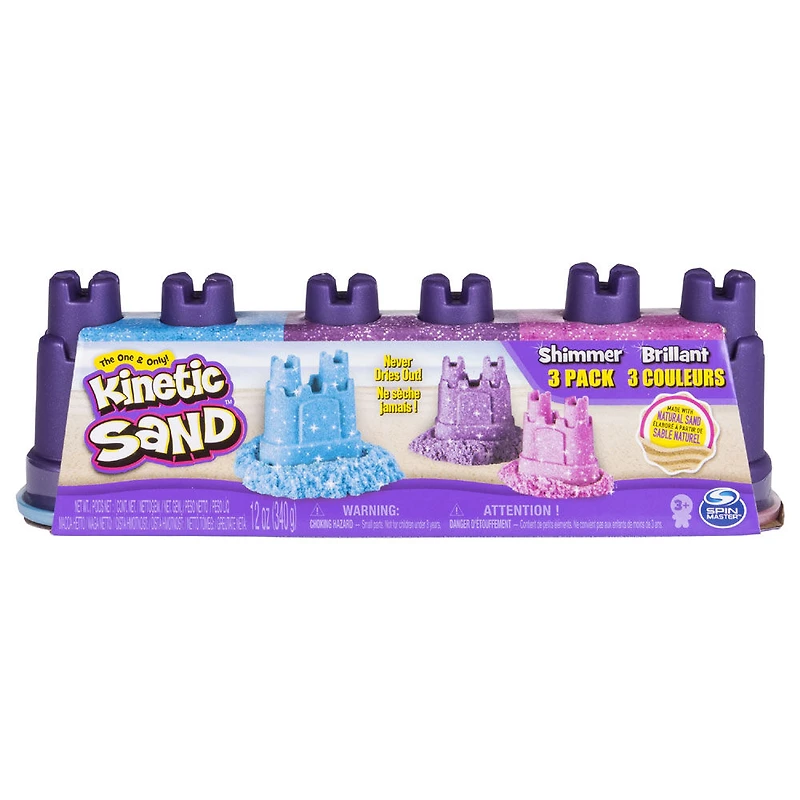 Créez en utilisant trois teintes éblouissantes de pâte de Kinetic Sand, uniquement disponibles dans le coffret de sables scintillants! li> Chaque nuance de sable pastel scintille et brille! Utilisez les contenants en forme de château comme moules et vous pourrez construire votre propre royaume Kinetic! Li> Kinetic Sand ne contient ni gluten, ni caséine ni blé! Amusant à écraser et presser, c'est sécuritaire pour tout le monde! Li> Kinetic Sand est destiné aux enfants à partir de 3 ans. Li> Contenu: 118 ml de sable bleu, 118 ml de sable rose, 118 ml de sable mauve Avec le Coffret Kinetic Sand, vous allez réussir des créations brillantes et scintillantes! Pour la toute première fois, votre irrésistible sable magique est disponible en trois superbes couleurs pastel! Chaque couleur est présentée dans un récipient en forme de château qui est aussi utilisé comme moule réutilisable! Pour de superbes créations Kinetic, à construire encore et encore! Avec ce sable qui ne sèche jamais, les possibilités sont infinies! Sans gluten, caséine ni blé, Kinetic Sand est ludique et sans danger! Malaxez, modelez et créez!