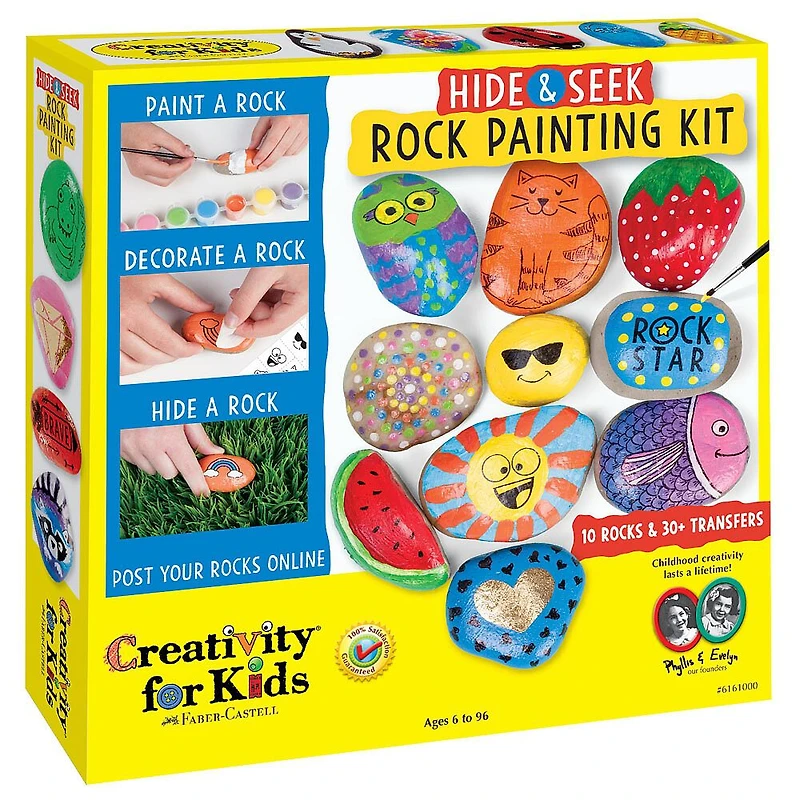 Le kit de peinture sur galets Cache-cache est une version revisitée de notre kit Rock-a-Doodle Deluxe de 2007. Résistant aux intempéries, il est idéal pour peindre des galets en extérieur avec vos amis et votre famille, et ainsi répandre la gentillesse, l'encouragement et la joie dans votre quartier, un galet à la fois. Votre kit contient 10 galets naturels, de la peinture résistante à l'eau, 2 pinceaux, plus de 30 motifs de transfert imperméables et 4 transferts dorés métallisés en bonus. Collez l'autocollant imperméable #creativityforkids sous vos galets pour suivre leurs trouvailles. Les peintres et les découvreurs sont invités à partager des photos de leurs galets sur nos pages Facebook et Instagram.