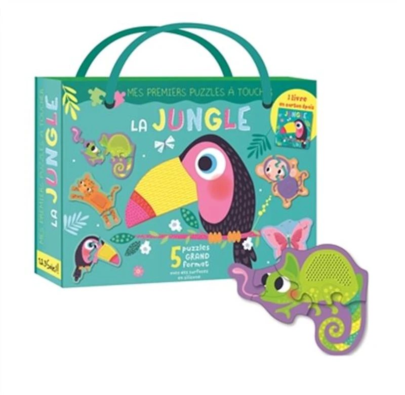 La jungle . Qui a une longue langue gluante ? C'est le caméléon !. Ce coffret contient un livre en carton épais et 5 puzzles à offrir aux jeunes enfants pour leur faire découvrir la jungle.. Les puzzles ont des surfaces à toucher en silicone : picots, bulles, vaguelettes, elles sont toutes douces et de textures différentes.. Une activité sensorielle pour découvrir de nouvelles matières et apprendre à se concentrer.. 1 livre en carton épais 5 puzzles grand format 4 grandes pièces Des surfaces à toucher en silicone Des puzzles grand format, de taille et de forme variées