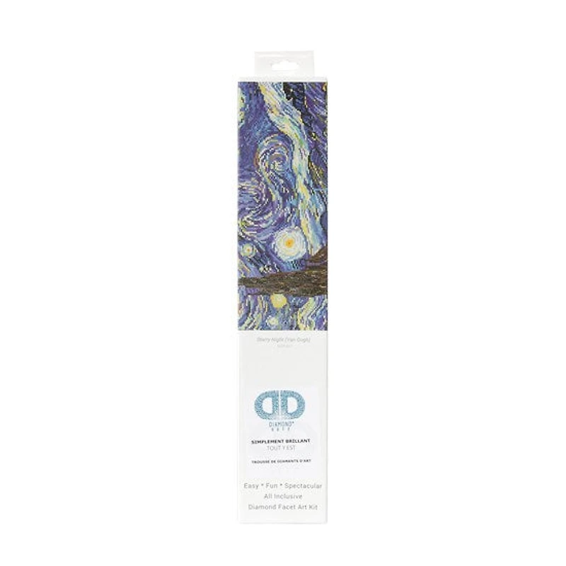 Créez une reproduction scintillante du célèbre tableau La Nuit étoilée de Van Gogh ! Diamond Dotz est une nouvelle technique artisanale fascinante qui consiste à créer de superbes motifs à l'aide de minuscules facettes ressemblant à des diamants. La technique est rapide et remarquablement facile à maîtriser, que vous soyez débutant ou expérimenté : il vous suffit de placer les diamants avec la pointe en cire, selon la liste des symboles. Les diamants en résine époxy de 2,8 mm sont fabriqués à partir de matières premières de première qualité (non recyclées). Leur particularité ? Elles présentent 13 surfaces différentes qui reflètent la lumière et créent des résultats scintillants impressionnants. La toile est  faite d'un tissu 100 % polyester de haute qualité et de poids élevé, conçu pour résister aux marques de pliage et suffisamment solide pour supporter sans problème le poids des diamants : elle est aussi idéale pour l'encadrement ! De plus, l'adhésif utilisé est un produit exclusif de haute technologie conçu par des experts de l'industrie spécifiquement pour l'activité Diamond Dotz : cela signifie que vos diamants ne se détacheront pas.Permanents et résistants aux rayures et à la décoloration, tous les motifs sont imprimés à l'aide d'encres non toxiques et respectueuses de l'environnement, et chaque motif Diamond Dotz est méticuleusement interprété par l'un de leurs talentueux artistes. L'éclat éblouissant de chaque diamant et la qualité supérieure de la toile permettent de réaliser un projet unique en son genre. À vous de libérer votre créativité ! Comprend une toile imprimée 100 % polyester, 25 276 Diamond Dotz (triés par couleur), une pointe de cire, un plateau de bricolage, un boîtier à cire et des instructions.Niveau : intermédiaireÂge : 13 ans et plusTaille du motif : 41 x 51 cm
