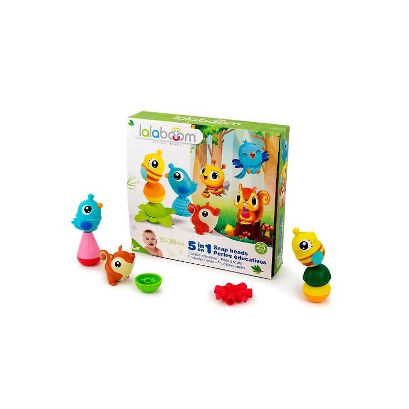 PERLES LALABOOM - Ce pack contient 3 perles d'animaux et 8 perles avec accessoires pour favoriser les découvertes sensorielles et le développement de la motricité fine des enfants de 10 mois à 4 ans. Booster d'imagination : les perles d'animaux stimulent la narration et développent l'imagination de votre enfant. Chaque animal peut être tordu, ouvert et combiné avec toutes les perles et produits LALABOOM. JOUET DE DÉVELOPPEMENT ÉTAPE PAR ÉTAPE - À 10 MOIS, c'est le temps des découvertes sensorielles grâce aux différentes textures et couleurs des perles, votre enfant commence aussi à assembler - 15 MOIS, votre enfant ouvre et ferme les perles - 18 MOIS, l'enfant peut mélanger les perles entre elles - 24 MOIS, c'est le temps de construire ! Votre enfant peut créer de longs liens de perles et explorer sa créativité. - 36 MOIS, votre enfant imagine des histoires impliquant les animaux et les perles et peut également apprendre à lacer, première étape avant l'écriture, grâce à l'outil de laçage flexible. Une foule de bienfaits - INSPIRÉS PAR MONTESSORI - Découvertes sensorielles ; motricité fine ; acuité visuelle ; dextérité ; concentration ; coordination oeil-main ; logique ; créativité, imagination, cause-effet, tri, correspondance.
