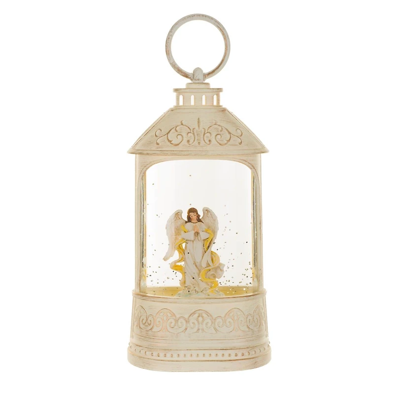 Lanterne musicale en plastique blanc avec Boule à neige DEL ange paisible et paillettes