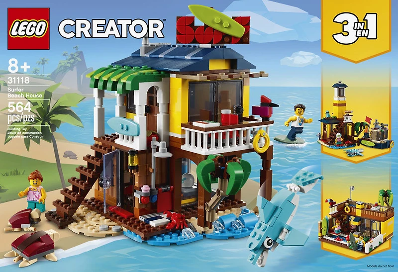 L'ensemble de construction La maison de la plage du surfeur LEGO® Creator 3en1 (31118) captivera les enfants pendant des heures et comporte 3 modèles en 1 : une cabane de surf, un phare et un pavillon de piscine Cet ensemble LEGO® comprend également les figurines d'un homme et d'une femme que les enfants peuvent inclure dans leurs aventures amusantes sur la plage La cabane de surf a 2 étages avec des charnières qui permettent de l'ouvrir pour différentes options de jeu et est accompagnée de 3 animaux marins en briques : un dauphin, une tortue de mer et un bébé tortue de mer Le phare est accompagné d'un petit bateau et d'une raie manta, tandis que le pavillon de piscine se compose de 2 étages et comprend des planches de surf et une piscine en briques Cet ensemble LEGO® Creator 3en1 de 564 pièces offre une expérience de construction enrichissante pour les amateurs de LEGO âgés de 8 ans et plus et fait un excellent cadeau pour un anniversaire ou les Fêtes Les enfants adoreront aller surfer et jouer avec les animaux grâce à l'ensemble La maison de la plage du surfeur LEGO® Creator 3en1 (31118). Ils ont tout ce qu'il faut pour créer des histoires passionnantes : une cabane de plage à 2 étages avec des charnières, 2 figurines et 3 animaux marins en briques : un dauphin, une tortue et un bébé tortue. Des jouets 3en1 passionnants pour les enfants Les enfants seront ravis de construire 3 modèles différents avec cet ensemble LEGO Creator 3en1. Ils peuvent construire la maison, la transformer en phare ou en pavillon de piscine, ou utiliser les briques et les pièces pour créer quelque chose de nouveau. Des cadeaux qui stimulent l'imagination des enfants Les ensembles LEGO Creator 3en1 permettent aux enfants de s'amuser avec 3 modèles différents dans chaque ensemble ! Les options de jeu sont infinies car chaque modèle peut être démonté et transformé. La gamme comprend des ensembles 3en1 incroyables avec des animaux, des voitures et des maisons.