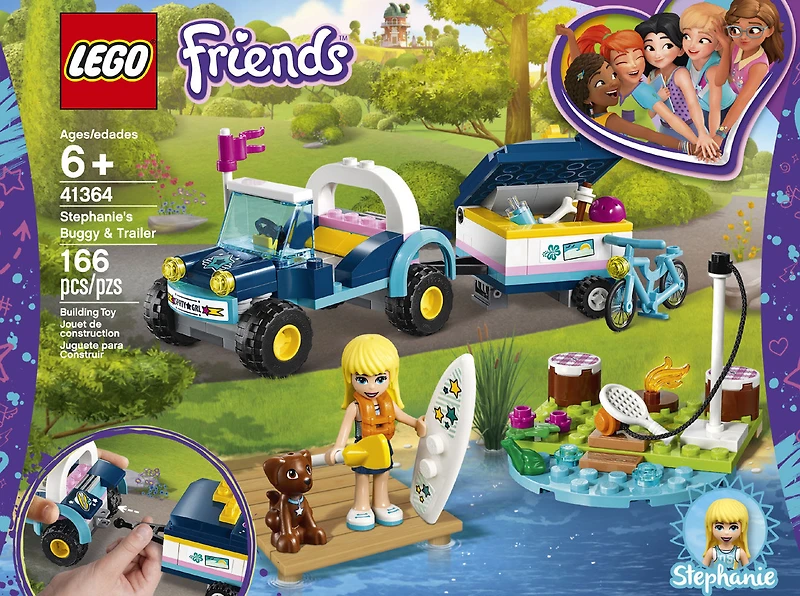 Profite d'une journée d'activités avec Le buggy et la remorque de Stéphanie LEGO Friends 41364 Cette fille active qui aime le plein air est prête pour une journée bien remplie Attache la remorque avec un toit à charnières au buggy tout-terrain et utilise-la pour transporter tout l'équipement Prolonge le jeu en aidant Stéphanie à profiter de la campagne sur son vélo et sa planche à rame, ou à jouer au tennis près du feu de camp : tout ce qu'il faut c'est un casque et une imagination débordante ! Inclut une minipoupée de Stéphanie et une figurine de chien et de grenouille