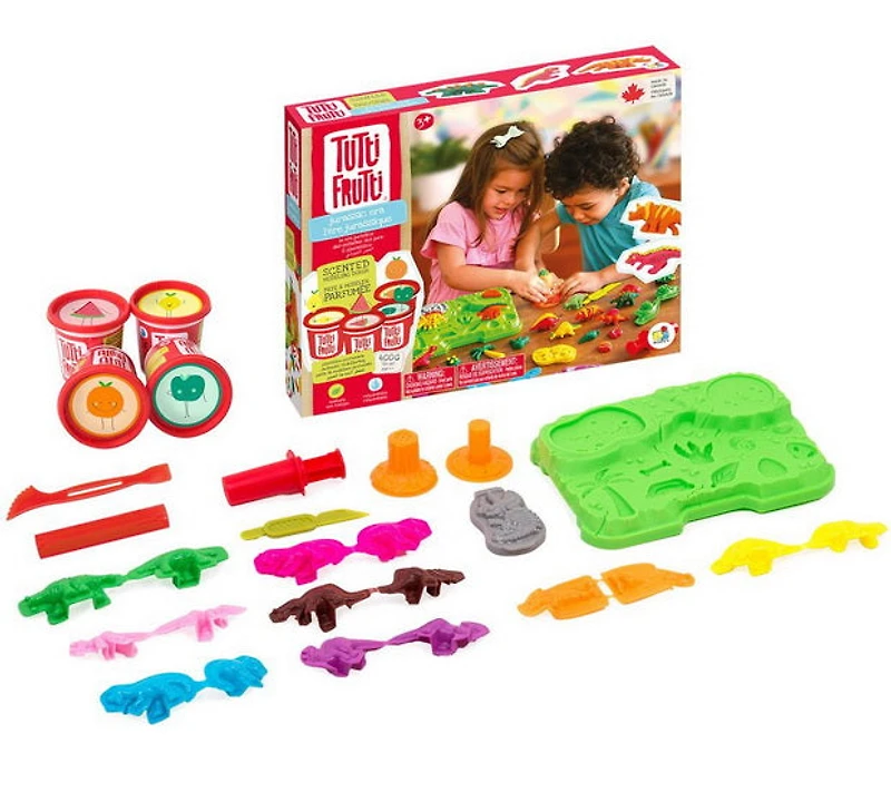 Description : L'ère jurassique fluo Tutti Frutti de Bojeux comprend 4 pots de pâte à modeler parfumée assortie aux fruits, des moules et des outils en plastique pour créer des scènes peuplées de dinosaures. L'enfant explore l'univers fascinant de l'ère jurassique tout en développant sa motricité fine et sa créativité! La pâte à modeler Tutti Frutti dure longtemps, car elle est réhydratable : ajoute un peu d'eau et elle redevient malléable et homogène.