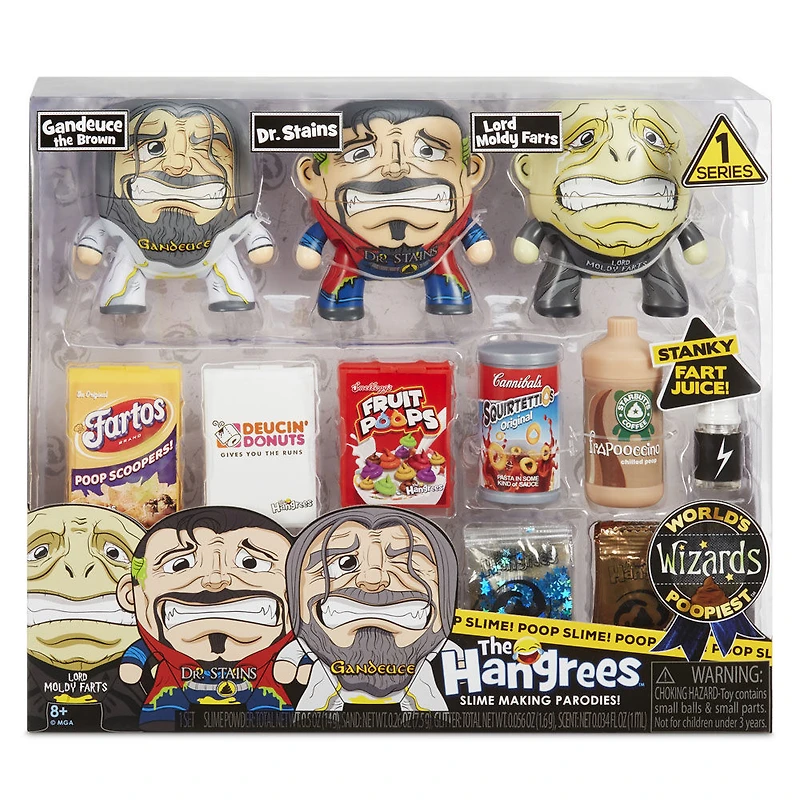 Ces figurines Parodie scandaleuses de culture pop à collectionner ont faim. DONNEZ-LEUR leurs aliments, boissons et goûters Parodie préférés. Puis, AGITEZ-LES pour qu'elles fassent diverses CROTTES mystérieuses en gelée ! Chaque personnage The Hangrees parodie l'un des films, jeux vidéo, collations préférés des enfants et fait bien plus encore, car il fait bon rire. It's Good to Laugh!. Il y a 35+ figurines The Hangrees à collectionner, incluant également les personnages " métallisés " rares et spéciaux ! Bienvenue à l'univers farfelu et étrange des figurines The Hangrees où tout a une odeur nauséabonde ! Qu'il s'agisse des franchises cinématographiques de 23 films où le monde est toujours anéanti dans CHAQUE FILM, de jeux vidéo de combat royal qui sont TOUS LES MÊMES ou d'émissions de télé ravivant des boissons gazeuses des années 80 que personne ne veut plus consommer, bref, tout est ridiculisé. Vous le savez, nous le savons et ces grosses légumes n'aiment pas que nous le soulignions en promouvant des figurines Parodie hilarantes. Les figurines Hangrees sont des parodies de vos marques, films, jeux vidéo préférés de la culture pop, et bien plus. Elles sont basées sur des personnages de magiciens célèbres ! Qu'est-ce qui fuit de leur derrière ? Mélange la poudre de gelée et la texture incluses avec de l'eau tiède à l'intérieur de tes figurines The Hangrees afin de créer ta propre crotte en gelée mystérieuse ! Chaque figurine The Hangrees fait réellement une crotte en gelée lorsque tu soulèves les jambes de la figurine Inclut : 3 figurines Parodie exclusives, non disponibles ailleurs : Dr. Stains, Lord Moldy Farts et Gandeuce the Brown ; 5 récipients d'aliments Parodie (Fruit Poops Cereal, Deucin' Donuts, Fartos Scoops, Starbutts Frapoocino et Squritetti Uh-Ohs) ; 5 poudres de gelée mystérieuse ; 5 textures de gelée ; 1 arôme de gelée de liquide flatulent malodorant et une toilette pour y ranger la gelée 35+ figurines Parodie The Hangrees hilarantes de culture pop à collectionner !