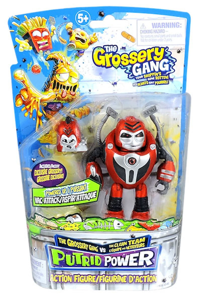 C'est le temps pour Les Grosseries de passer à la puissance supérieure! Quand tu veux être le plus dégoûtant, c'est l'heure de prendre une dose répugnante de PUTRID POWER! Les Grosseries sont maintenant prêtes à combattre l'équipe des Nettoyeurs devenant les figurines d'action les plus suppurantes à ramper des poubelles! La mission d'Aspir'attaque est d'aspirer tous les déchets et de les pétrifier! Chaque figurine vient avec leur propre arme exclusive des Grosseries. Toutes les figurines sont entièrement articulées et fonctionnent avec les trois ensembles de jeu! Soyez prêts pour de l'action dégoûtante et destructrice! Chaque figurine vient avec leur propre arme hilarante associée à son personnage
